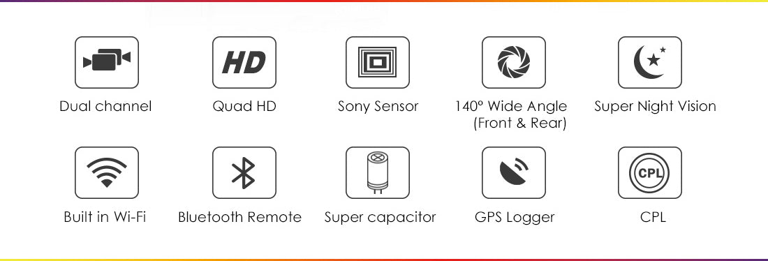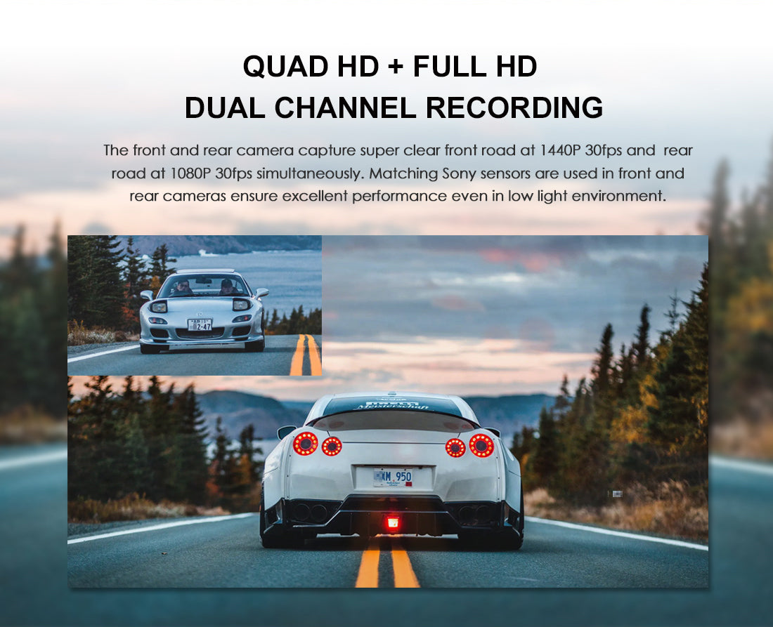 • Video ResolutionFront: Quad HD (2560 x 1440P 60fps) ; Rear: Full HD (1920 x 1080P 30fps);