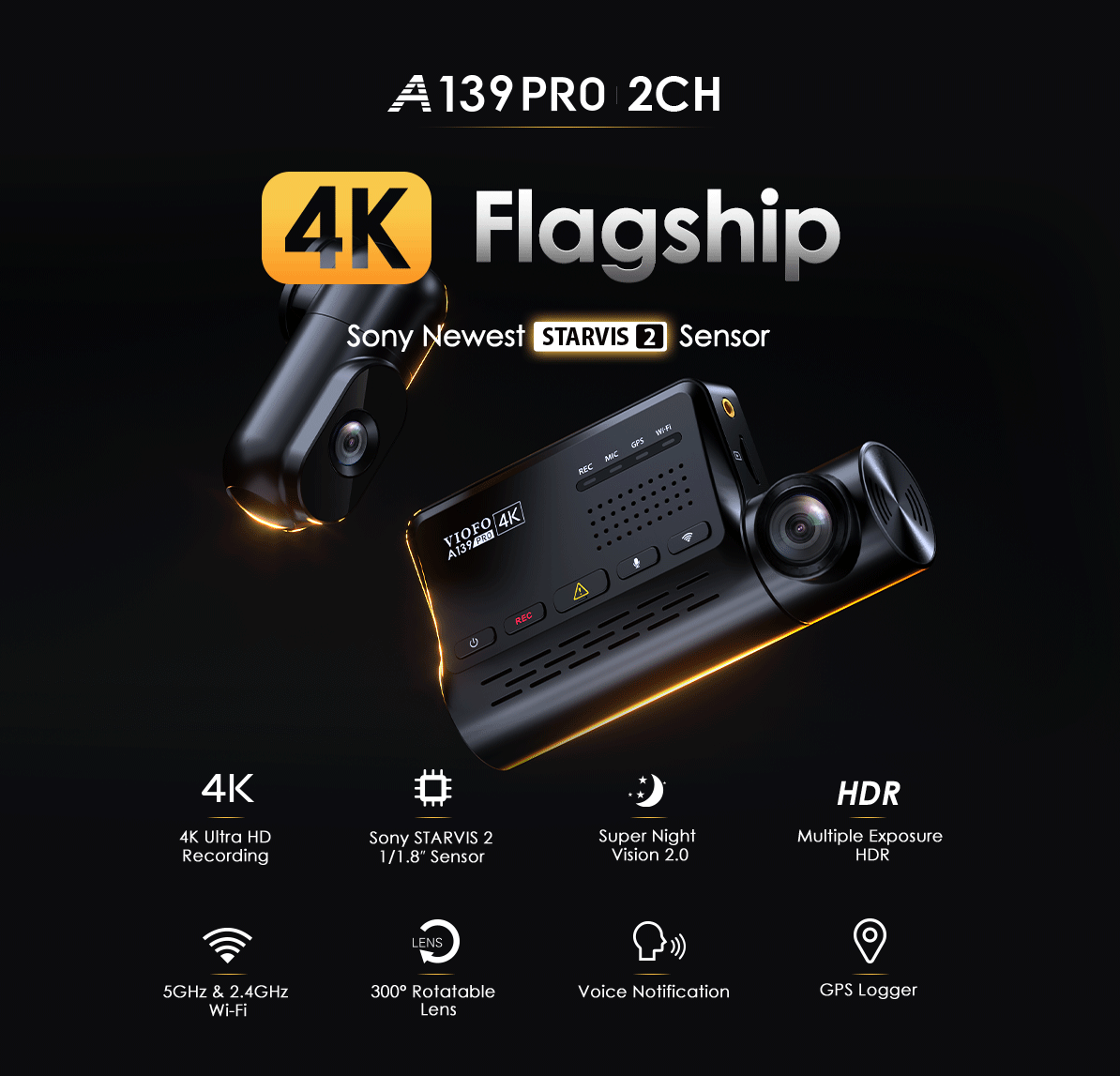 Being the first to deploy the newest Sony STARVIS 2 tech, A139 Pro is the first real 4K dashcam supporting up to 3 channel recording, powerful enough to outbeat most exisiting 4K dashcam competitors with immensely upgraded image clarity and accuracy in license capturing.